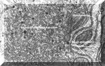 This electron micrograph shows an area of smooth endoplasmic reticulum consisting of tortuous tubules and vesicles. This field is from a liver cell. The smooth endoplasmic reticulum serves to metabolize glycogen (which are deposited as black rosettes over the area), and it contains enzymes needed to detoxify drugs.
