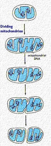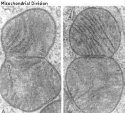 The Mitochondrial replication is diagrammed in the cartoon in the side bar and shown above in an electron micrograph. Mitochondria replicate much like bacterial cells. When they get too large, they undergo fission. This involves a furrowing of the inner and then the outer membrane as if someone was pinching the mitochondrion. Then the two daughter mitochondria split. Of course, the mitochondria must first replicate their DNA. This will be discussed in more detail in the next section. An electron micrograph depicting the furrowing process is shown in these figures. The figure above was taken from Fawcett, A Textbook of Histology, Chapman and Hall, 12th edition, 1994