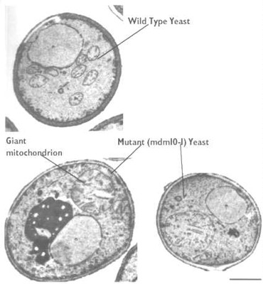 This has been shown in a study by Sorgo and Yaffe, J Cell Bio. 126: 1361-1373, 1994. They showed the result of the removal of an outer membrane protein from mitochondria called MDM10. This figure shows the results. The mitochondria are able to take in components and produce membranes and matrix enzymes. However, fission is not allowed. Thus, the result is a giant mitochondrion. This is illstrated in the micrograph below.