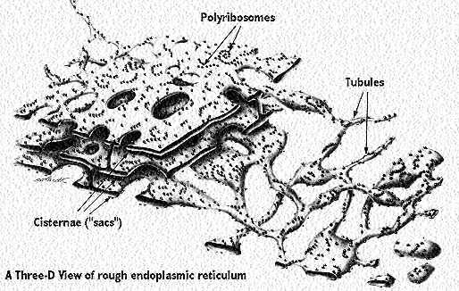 Rough endoplasmic reticulum bears the ribosomes during protein synthesis. The newly synthesized proteins are sequestered in sacs, called cisternae . The system then sends the proteins via small vesicles to the Golgi Complex , or, in the case of membrane proteins, it inserts them into the membrane. As shown in this diagram, rough endoplasmic reticulum may either be vesicular or tubular. Or it may consist of stacks of flattened cisternae (like sheets) that may have bridging areas connecting the individual sheets. The Ribosomes sit on the outer surfaces of the sacs (or cisternae). They resemble small beads sitting in rosettes or in a linear pattern.