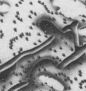 The above photograph shows a group of ribosomes in action. They are connected by a strand of messenger RNA which runs between the large and small subunits. They read the 3 nucleotide code for an amino acid and the appropriate transfer RNA brings the amino acid to the growing polypeptide chain. In this photograph, we see the growing peptide chain radiating at right angles to the mRNA. It extends from the base of the large ribosomal subunit.