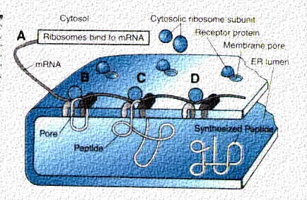 This cartoon shows the binding site on the rough endoplasmic reticulum. The membrane of the rough endoplasmic has a receptor that binds the larger subunit of the ribosome. Next to the receptor is a pore that allows newly synthesized proteins to enter and be stored initially in the rough endoplasmic reticulum cisterna or lumen. Note that the ribosomes are still connected to one another outside the rough endoplasmic reticulum by the mRNA which runs between the large and small subunits.