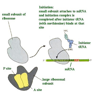 This then attracts the large ribosomal subunit which will bind to the small subunit. Note that it has an A site and a P site. These are different binding sites for the tRNAs. The cartoon below describes the next phase in the process.