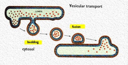 Transport of material in and out of the Golgi complex involves budding and fusion of vesicles. This cartoon shows that the membranes of each join and align themselves during the process so that the inside face remains in the lumen and the outside face remains towards the cytoplasm.