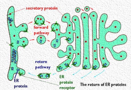 This cartoon shows the process. The protein destined for secretion is red. The blue protein must remain in the rough endoplasmic reticulum. The rough endoplasmic reticulum has inserted a receptor protein on the membrane it sends to the Golgi complex in the transitional vesicles (shown in green). These are retrograde vesicles and are therefore coated with "COPI" (coatamer). The ER protein receptor captures all of the protein that carries the ER residency signal. . Vesicles then bud from the Golgi complex and move back to the rough endoplasmic reticulum. The receptor can circulate and continue to return the proteins needed by the endoplasmic reticulum.