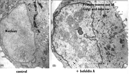 A drug called "brefeldin A" blocks the transfer of protein to the Golgi complex, however the reverse transport is not blocked. The following electron micrograph shows the results of an experiment after a brefeldin A block.