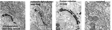 The functional differentiation of the Golgi complex can be studied with the electron microscope with specific techniques that detect enzymes. The cis region is rich in lipid-bearing membranes and can be delineated by osmium tetroxide labeling. The middle regions label for enzymes that add carbohydrates or other groups on the product. The inner, or Trans region, is the area where the lysosomes are sorted. Therefore, it is heavily labeled for acid phosphatase.