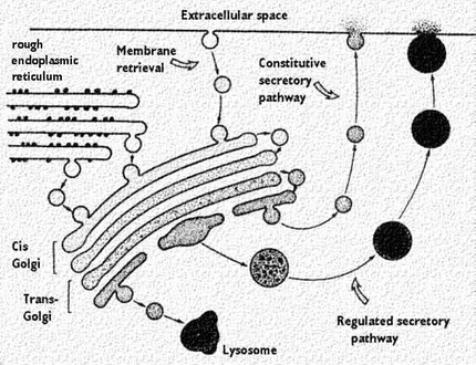 The Golgi complex controls trafficking of different types of proteins. Some are destined for secretion. Others are destined for the extracellular matrix. Finally, other proteins, such as lysosomal enzymes, may need to be sorted and sequestered from the remaining constituents because of their potential destructive effects. This figure shows the two types of secretory pathways. The regulated secretory pathway, as its name implies, is a pathway for proteins that requires a stimulus or trigger to elicit secretion. Some stimuli regulate synthesis of the protein as well as its release. The constitutive pathway allows for secretion of proteins that are needed outside the cell, like in the extracellular matrix. It does not require stimuli, although growth factors may enhance the process.