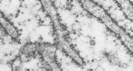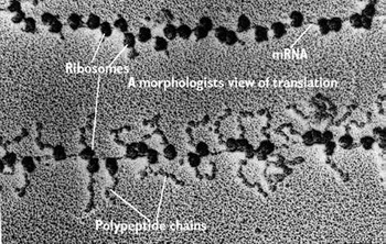 The above photograph shows a group of ribosomes in action. They are connected by a strand of messenger RNA which runs between the large and small subunits. They read the 3 nucleotide code for an amino acid and the appropriate transfer RNA brings the amino acid to the growing polypeptide chain. In this photograph, we see the growing peptide chain radiating at right angles to the mRNA. It extends from the base of the large ribosomal subunit.