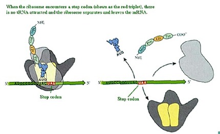 The code is actually translated on structures that are also made in the nucleus, called Ribosomes. These ribosomes provide the structural site where the mRNA sits. The amino acids for the proteins are carried to the site by "transfer RNAs,". In the cartoon to the left, these are shown as blue molecules. Each transfer RNA (tRNA) has a nucleotide triplet which binds to the complementary sequence on the mRNA (see the three letters at the bottom of each molecule).